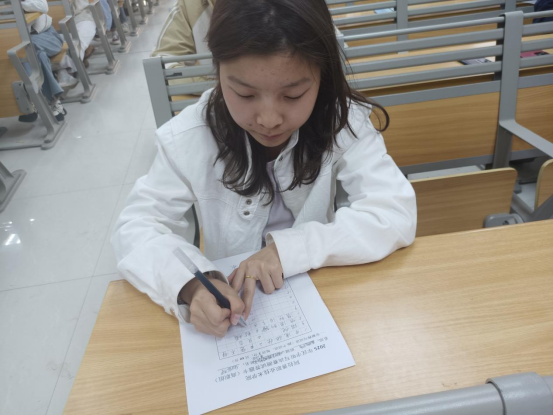 决赛现场,语文教师设计了形式多样的测试内容:有听解释、读音,书写字词题, 有按笔顺书写题,还有经典诗词默写题。比赛现场鸦雀无声,却暗流涌动——选手们执笔如剑,沉着应战。那一行行工整娟秀的字迹,那一笔笔流畅规范的书写,无不彰显着他们深厚的文化底蕴和扎实的书写功底。这场无声的较量,恰是中华传统文化在新时代学子笔尖的生动传承。